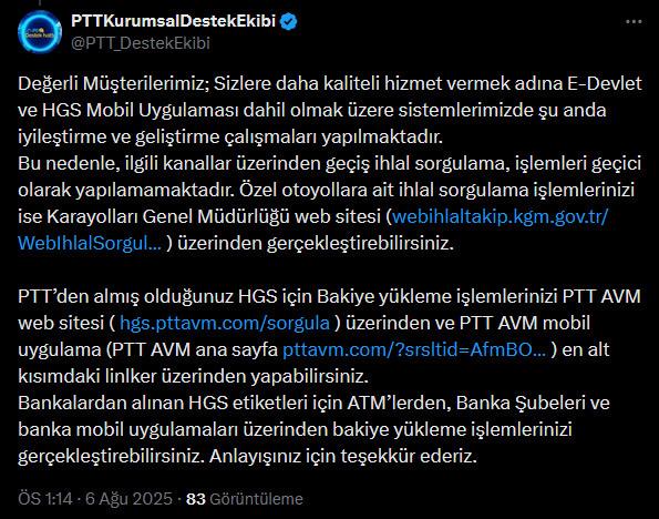 HGS sistemine bir müddettir erişim sağlanamıyor, şoförler bakiye yükleme süreci yapamıyordu. PTT’den yapılan açıklamada, ihlalli geçişte son ödeme tarihi dolan müşterilere ek müddet verileceği belirtildi.
